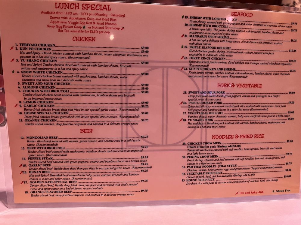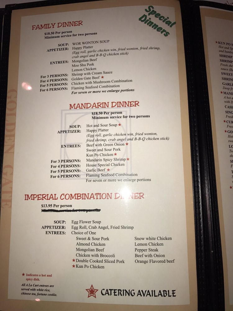 Golden Gate Chinese Restaurant, located in Mesa, AZ, offers a casual dining experience with a variety of Chinese dishes. The menu includes appetizers like the popular Happy Platter and Egg Rolls, as well as main dishes such as Kung Pao Chicken and Chicken with Broccoli. The Family Dinner options cater to groups with a selection of entrees to share. With positive reviews from customers praising the food quality and service, this restaurant stands out for its delicious flavors and cozy ambiance. With many vegetarian options available and the convenience of delivery and takeout, Golden Gate Chinese Restaurant is a solid choice for a satisfying Chinese meal in Mesa. Don't miss out on the chance to indulge in some of the best Chinese food Arizona has to offer.